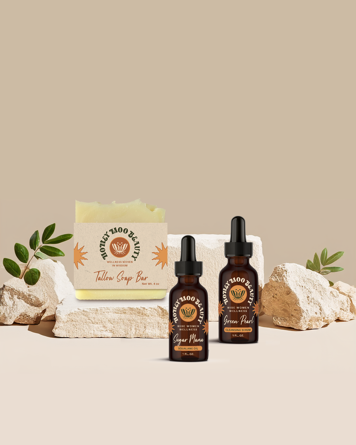 The Cleansing Trio offers a variety of hydrating and moisturizing cleansing products. From a tallow-based shower bar to an anti-aging cleanser to a hydrating serum. These three support a nourished skin barrier that isn't stripped of its natural oils, but instead replenishes and moisturizes, leaving the skin barrier intact with a balanced oil production.