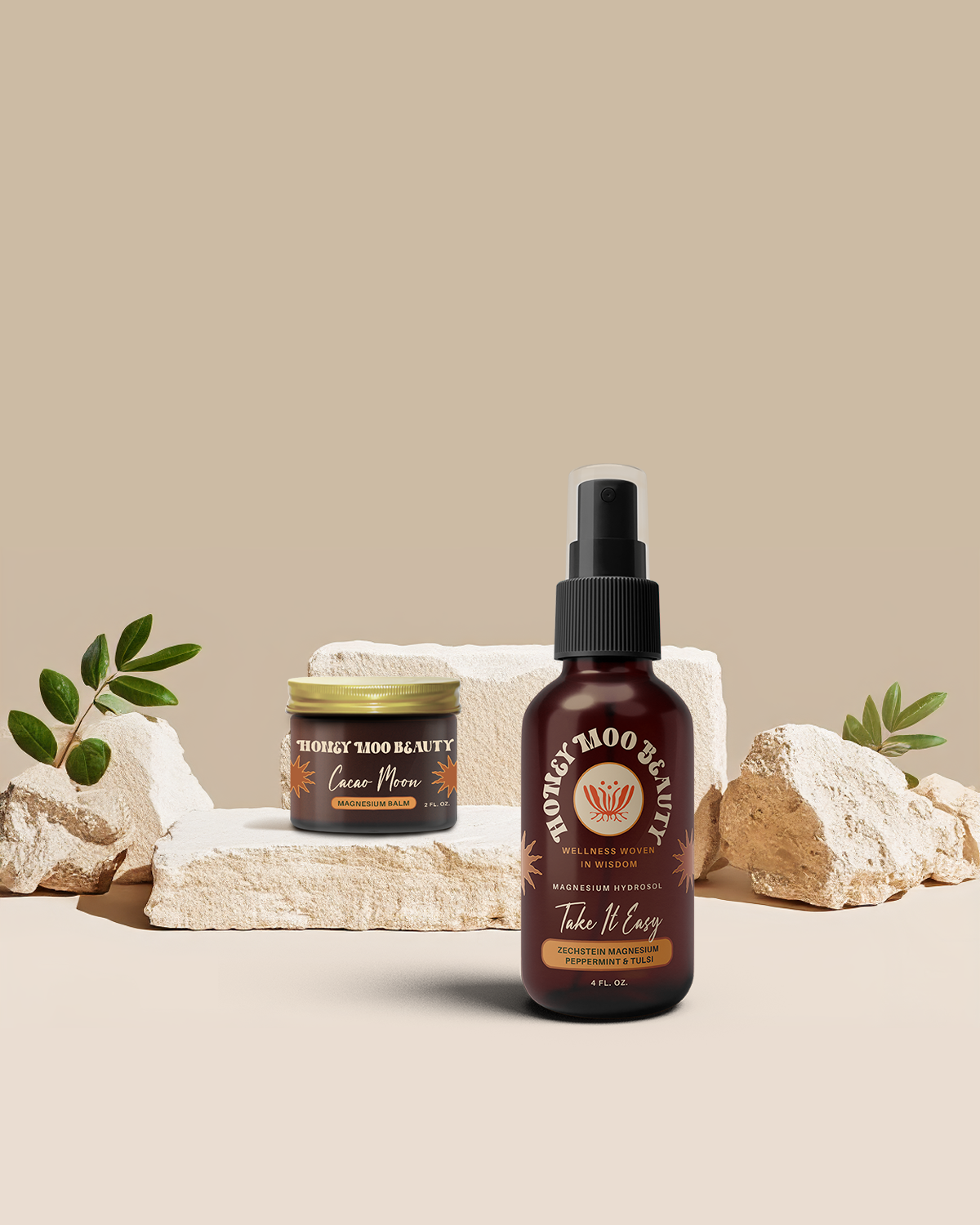 The magnesium duo is a mineral rich set of a balm and spray. The perfect pregnancy or postpartum gift bundle for a mama looking to add a little extra nourishment. Magnesium is an essential mineral that is hard to find in modern foods, adding a topical solution is one of the easiest and fastest ways to absorb magnesium, especially when applied on the bottom of your feet and back.