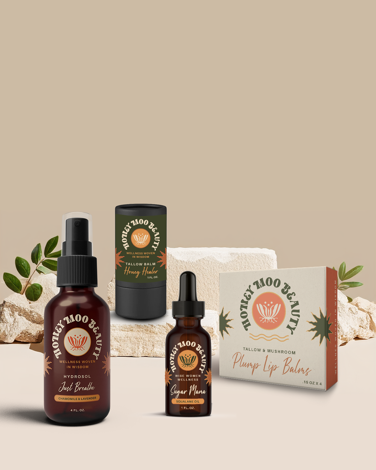 If you're overwhelmed with where to start in the holistic skincare world, this starter kit was curated just for you. Start your routine off with a simple 2-in-1 anti-aging/cleansing serum. Refresh your face with a hydrating facial toner that can also be used as a linen and bedding spray for its calming properties. Nourish your skin barrier with our convenient Honey Healer Tallow Stick, that is perfect for on the go. And don't forget your plumping lip balms!